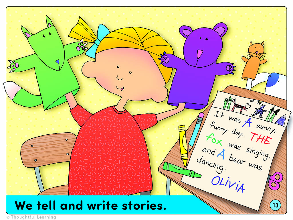 Current Page We write in journals. (interactive) We tell and write stories. (interactive) menuList The Writing Spot Big Book