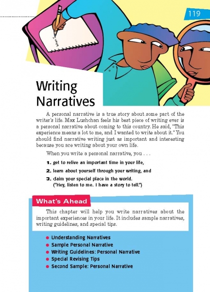 Read and discuss this page to give students a deeper understanding of narrative writing. Point out that the sharing of personal stories is a time-honored tradition. Have students think about stories that members of their extended families have shared. Recall one that you have heard from a family member; then ask for volunteers to share one they have heard. Ask what makes these stories interesting and fun to listen to.