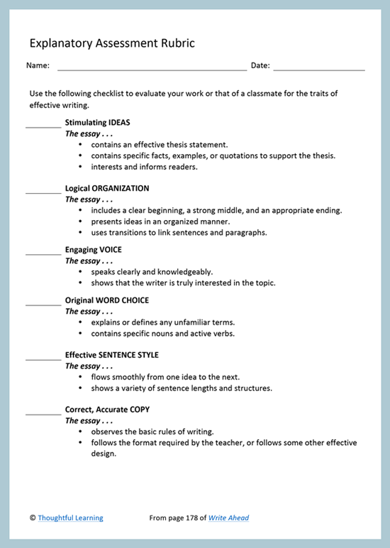 • Explanatory Writing Use this rubric with informational writing, including classification, cause-effect, comparison-contrast, and other explanatory essays.
