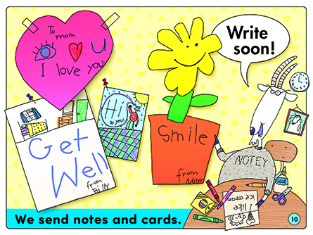 Explain that writers write the messages, and artists draw the pictures for greeting cards. Visit card sites you have previewed on the Internet. Many offer animated e-cards for kids. Contact the public relations departments of the big card companies about virtual tours, or search for “virtual tours” online.