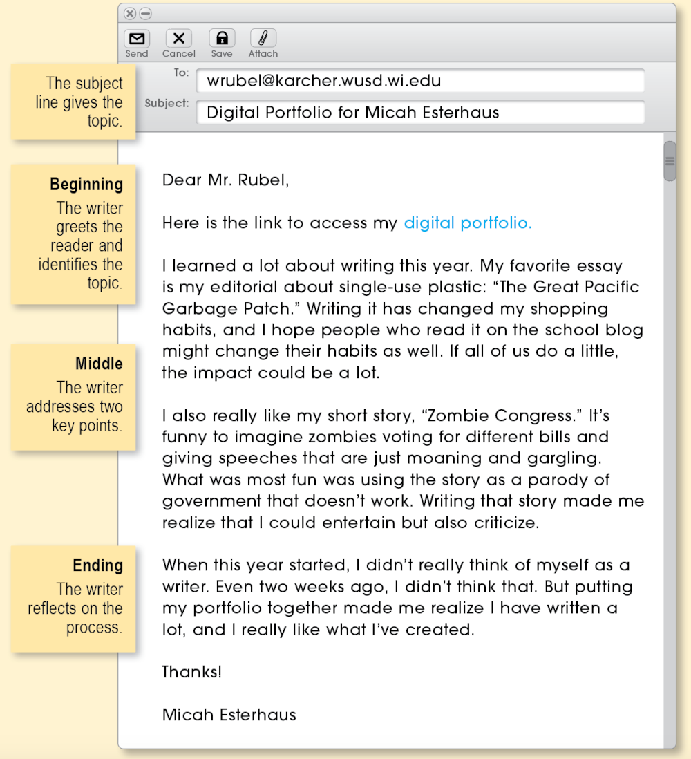 Email lets you communicate important information with adults and friends. Student Micah Esterhaus wrote the following email about her digital portfolio.