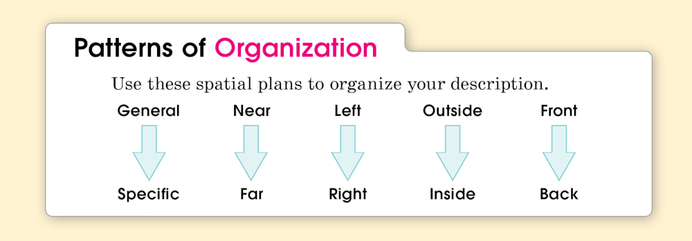 Middle ■ Describe your topic, presenting sensory details in the best possible order. (See page 40 for different patterns.) You can also reveal details as a camera would when moving through a scene in a movie.
