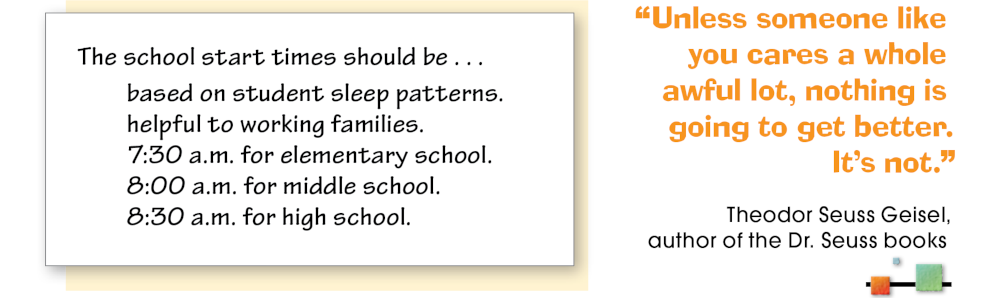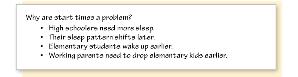 Student Douglas Previn wrote the following problem-solution letter to the president of his school board. He outlined a problem (school start times) and argued for a solution.