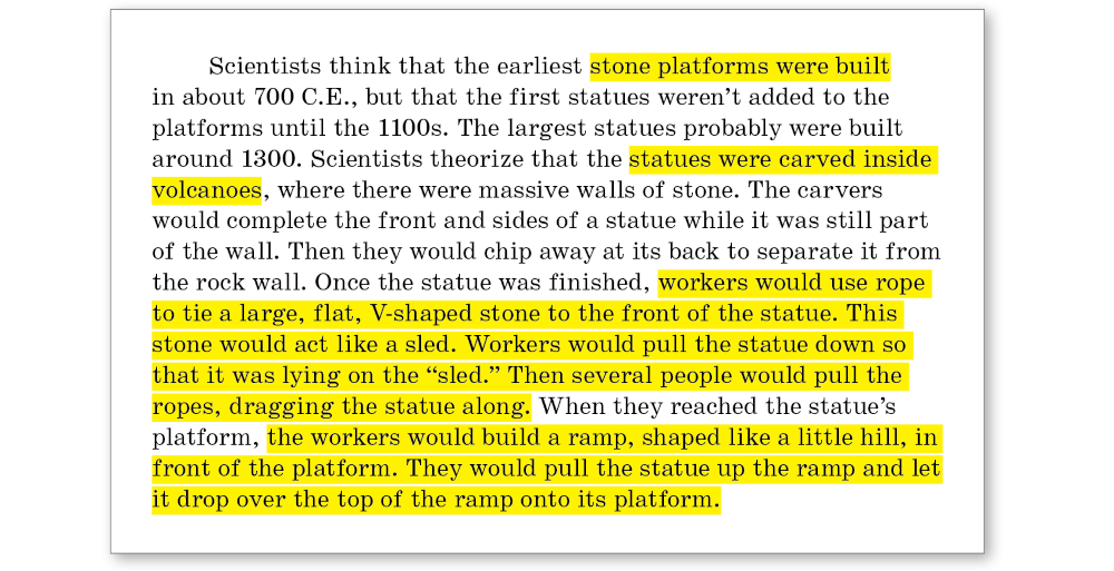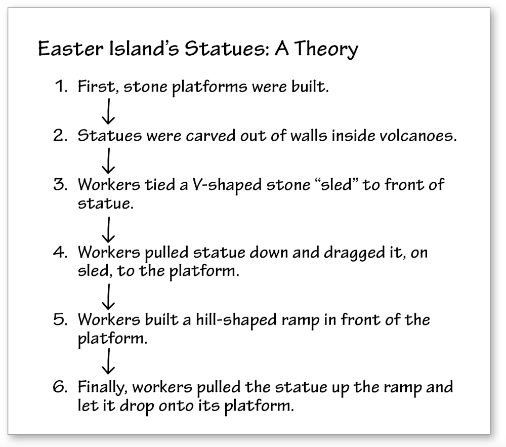 The text in this later part of the Easter Island article (page 382) follows a process pattern. It describes in detail how some scientists think the large statues of Easter Island were built over time.