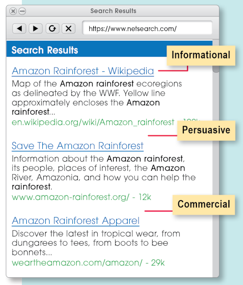 When you first conduct a search, scan the results page, looking for websites that may have the information you need. Read the heading and the first few lines of each suggested site to make sure it matches your subject and purpose. For example, this search for “Amazon rainforest” produced three top sites—one informational, one persuasive, and one commercial.