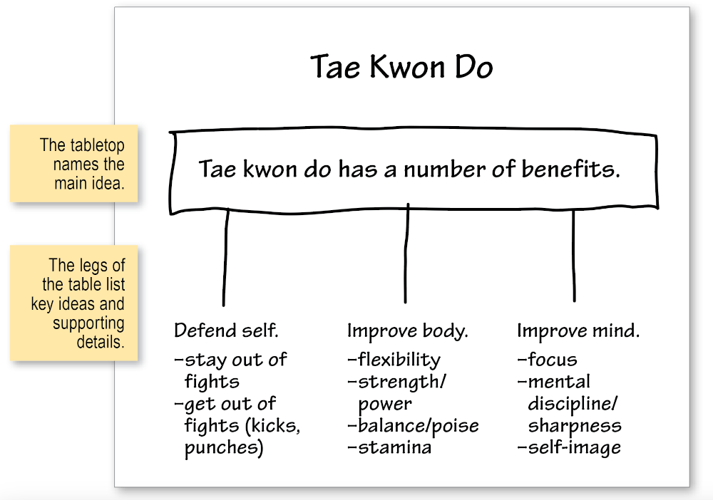 This information from a website about tae kwon do follows the main idea/supporting details pattern. The heading at the top of the page introduces the subject, the first couple of sentences share the main idea, and the rest of the page gives details that support this idea.