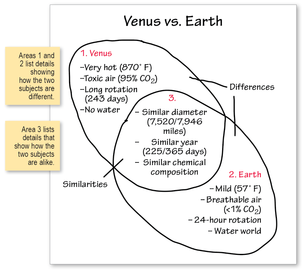 Comparison/contrast is another important pattern of nonfiction. The information below, from an astronomy website, compares Venus and Earth. The first paragraph in the excerpt describes similarities between the planets. The second paragraph focuses on the differences.