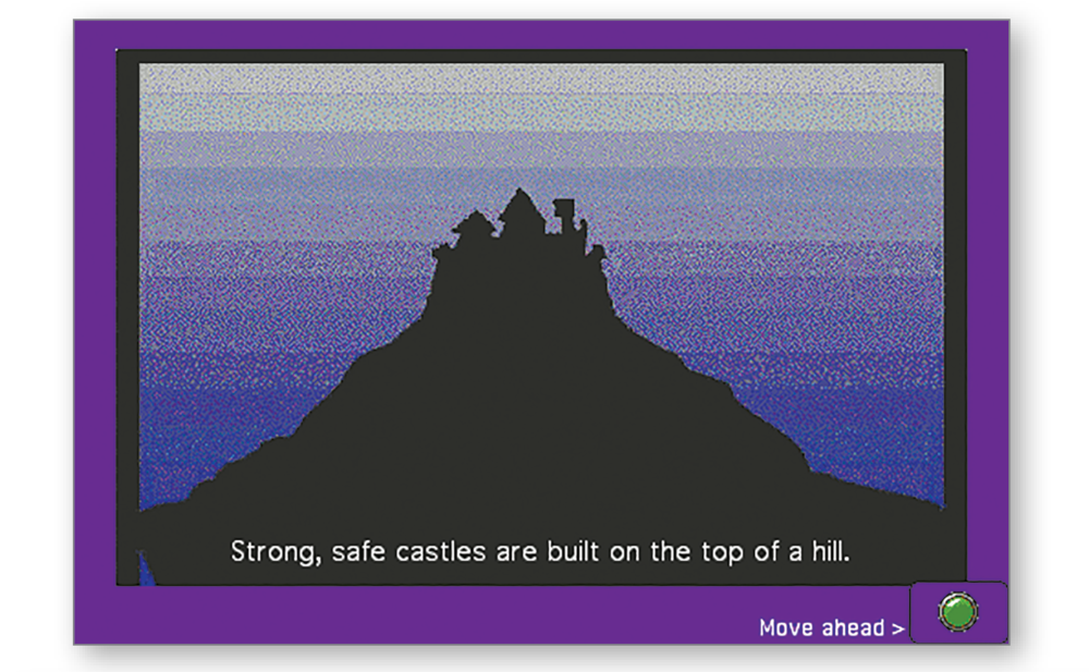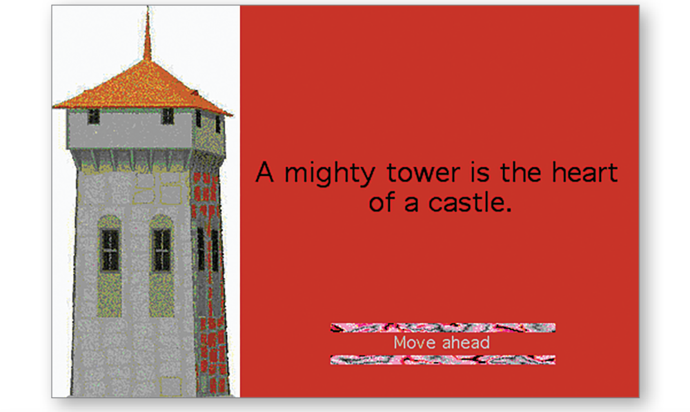 The castle rises from the top of a hill, so its defenders can easily see enemies approaching. Slabs of gray stone are chiseled into bricks and cemented with mortar to build a mighty tower, the heart of the castle. The tower is divided into four levels or stories. Lord Aaron’s wife will have her room on the top floor. Below that will be the lord’s quarters, and below that the dining rooms and servants’ quarters, and then the treasure rooms.