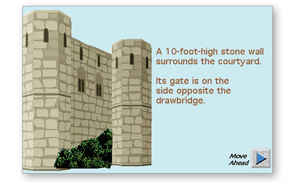 Around the moat is a large, grassy courtyard with a well (so the defenders will have water if the enemy lays siege to the castle), gardens, horse stables, and farm animals. Surrounding the courtyard is a 10-foot-high stone wall with only one gate. This gate is on a different side of the tower than the drawbridge. So if enemies do get through the gate, they must still work to get into the tower. As they walk or ride around the courtyard toward the drawbridge, defending soldiers can shoot arrows down at them.