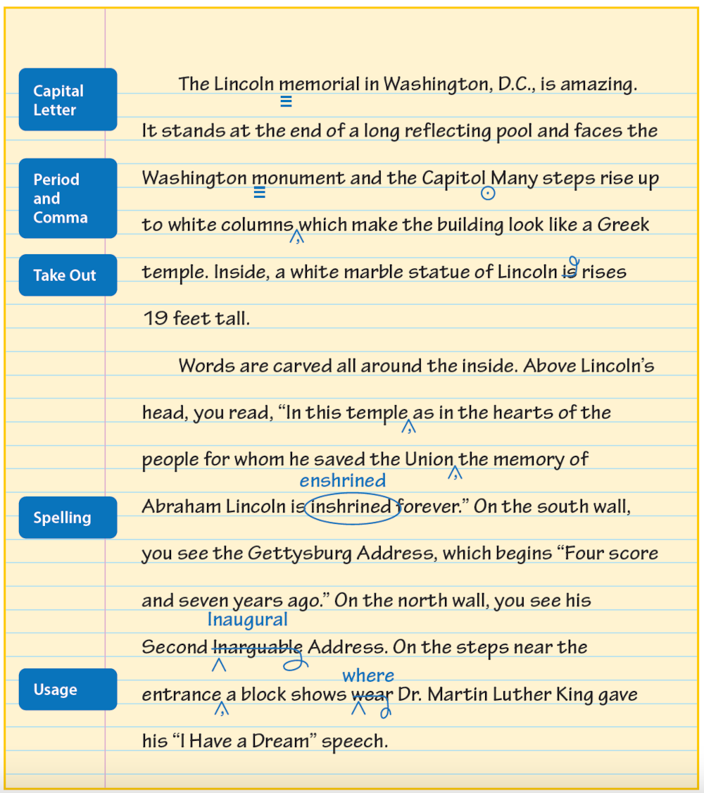The inside back cover of Writers Express has a list of common editing and proofreading marks. The sample below shows how you can use these marks when you do your editing.