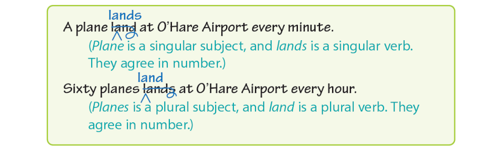 4. Subject-Verb Agreement Errors 🟪 Make sure all of your subjects and verbs agree. A singular subject takes a singular verb, and a plural subject takes a plural verb.